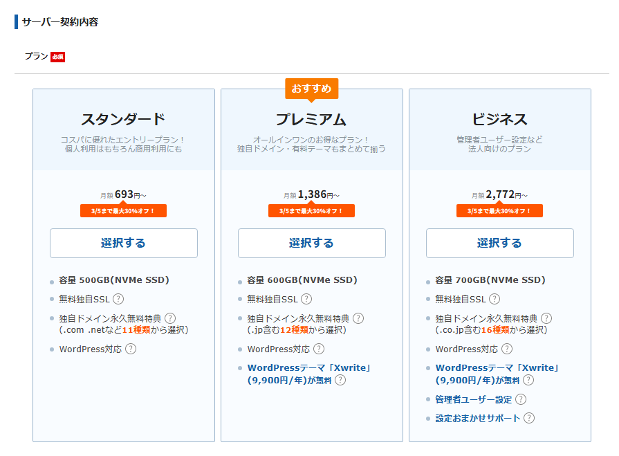 エックスサーバーにはスタンダード・プレミアム・ビジネスの3プランがあります。