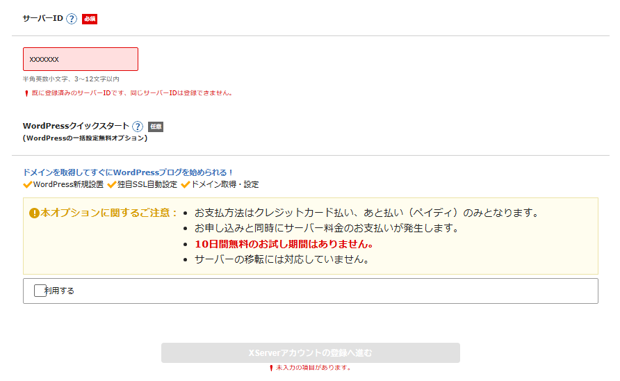 注意点: クイックスタートを利用すると10日間無料お試しが使えなくなり、申し込みと同時に料金が発生します。ただし、サーバー選定が済んでいるならお試し期間は不要なので、クイックスタートを使わない理由はありません。