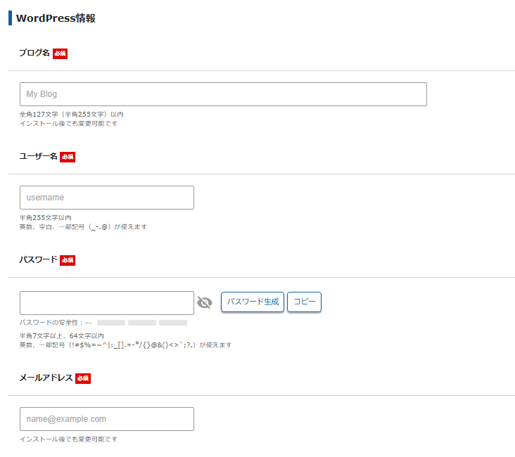 - ユーザー名: 管理画面ログインに使うもの(公開されないので何でもOK)